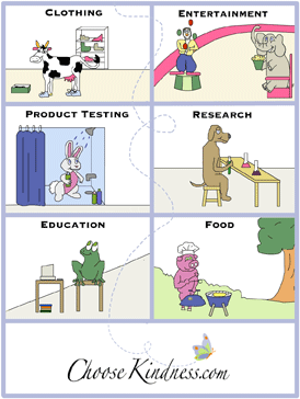 Each postcard includes six whimsical drawings depicting alternatives to the use of animals in clothing, entertainment, product testing, research, education and food. The back of the Any Occasion postcard is blank. The back of the Holiday postcard is mostly blank but contains the following message in small letters at the bottom of the card: There are simple ways we can bring more kindness into the world. The postcard is 4 1/4 ” x 5 1/2 ” and fits into a standard A2 envelope (4 3/8” x 5 3/4 ”). Note that if you plan to include enclosures, you may need a larger envelope. A2 and other envelopes are not available through this website but may be purchased at most office supply stores and copy centers.